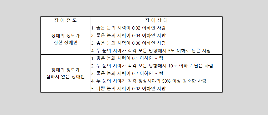 시각장애 등급 판정 기준은 두 눈 중 좋은 쪽의 눈이 시력 0.06 이하인 경우 중증으로 판단 되며, 양안 시야가 각각 5도 이하로 남은 경우도 중증 시각장애 판정을 받을 수 있습니다. 시력이 좋은 눈이 0.2 이하인 경우, 나쁜눈의 시력이 0.02 이하인 경우, 두 눈의 시야가 정상시야의 50% 이하인 경우, 두 눈 시야가 10도 이하인 경우에는 경증 시각장애로 판정 받을 수 있습니다.